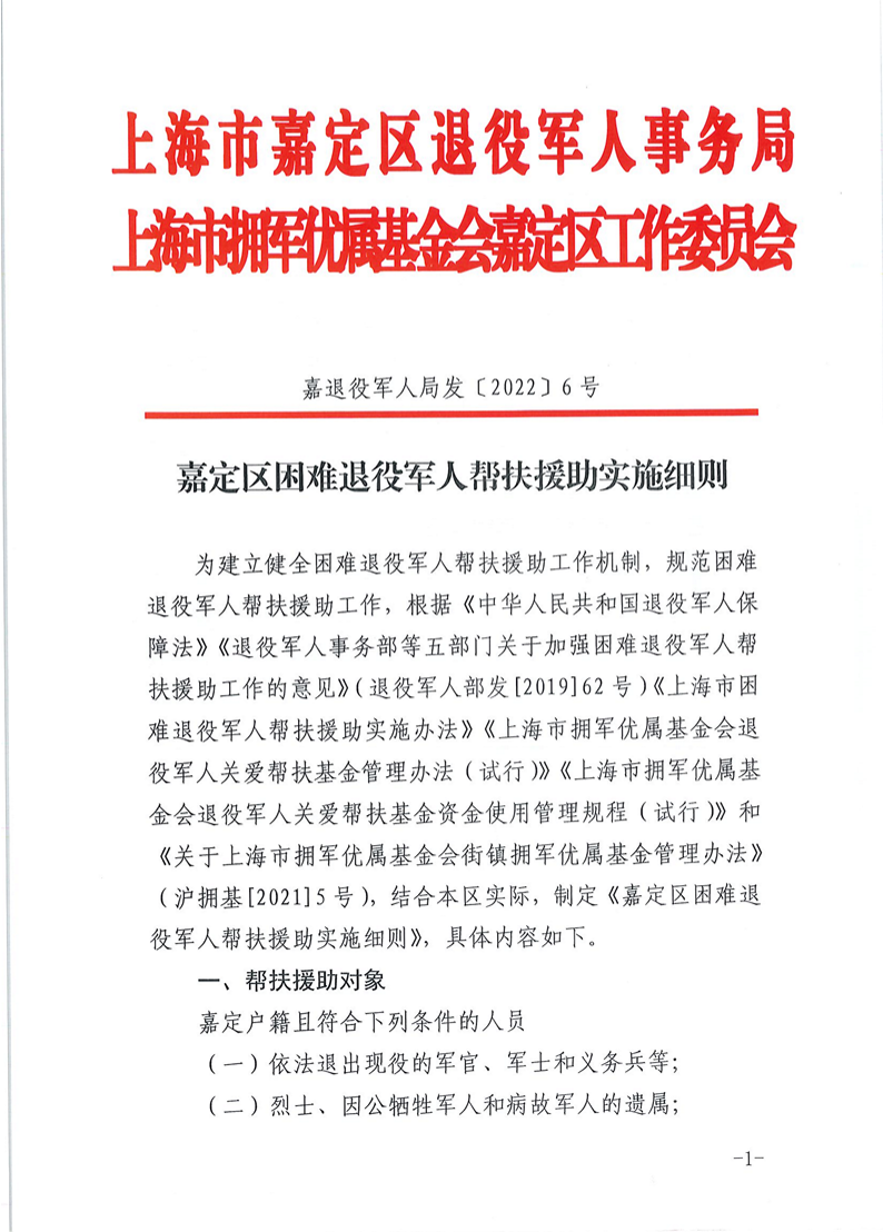 索引号: 00001434-9/2022-00000040 发布机构: 区退役军人局 生效日期: 2022年09月06日 文 号: 嘉退役军人局发【2022】6号 关键词: 主题分类: 政府文件 上海市嘉定区退役军人事务局 嘉退役军人局发【2022】6号 嘉定区困难退役军人帮扶援助实施细则 发布时间:2022-09-10 浏览次数: 次 【字体:小 大】