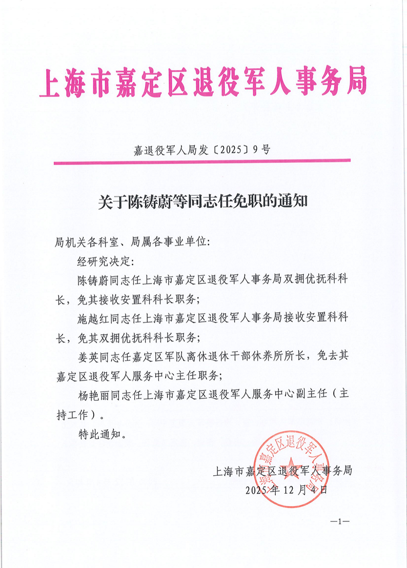 陈铸蔚同志任上海市嘉定区退役军人事务局双拥优抚科科长,免其接收安置科科长职务;